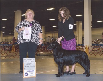 Jojo is a lovely dog and reminds us so much of his father and maternal grandfather. He has nice bone and carries good coat. He has a beautiful headpiece, although he does have a zipper. He has a nice dark eye, but they could be a little bit tighter. He is a moderate sized dog and is very interested in retrieving and swimming. Jojo won placements in BBE at the 2010 and 2011 FCRSA Specialties. In 2014, Jojo was awarded a Judge’s Award of Merit. In 2015 Jojo was Best Veteran in Sweepstakes at the SSFCRC and Best of Opposite in Veteran Sweepstakes at the SEFFCRC.